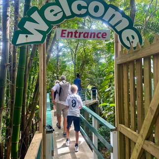 Men så endelig er vi fremme på dagens første post - Zip line parken. Det er totalt 12 liner vi skal igjennom og mellom de ulike postene går vi på stier i jungelen, i trapper eller over lianebroer.