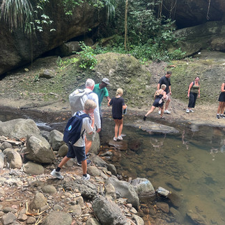 Etter så mye aktivitet er neste post på programmet deilig. En fredelig fottur til en bortgjemt, naturlig kildefoss. Er mulig å bade her, og som vanlig er det Matheo som hiver seg uti!