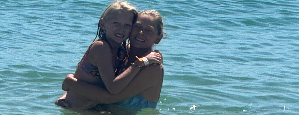 Stranden ligger på sørsiden, og ved at vinden blåser fra nord er det deilig og stille her. En utrolig flott strand som strekker seg over hele sørsiden av øya. Der vi kommer ut er det også en liten kiosk som bla selger is og sangria. Vi lar oss friste, og slår oss ned med noe kaldt å drikke og en is før vi går videre.