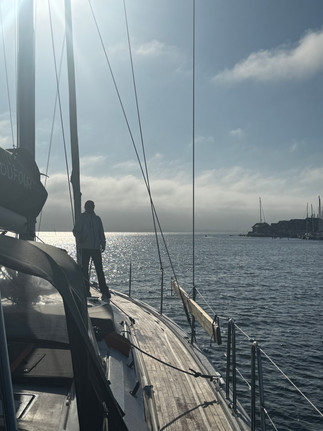 Spenningen er stor når vi våkner - får vi løs ankeret eller må vi ha hjelp? Vi gjør noen forberedelser, fester tau i kjettingen til kryssholt, dreier båten 180 grader, og smokk så løsner det! To fornøyde personer som setter kursen sydover i retning Anholt!