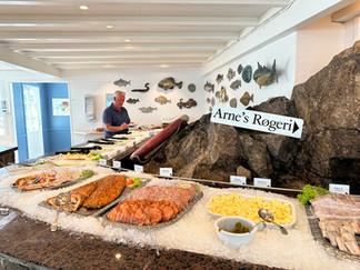Vi tar en sen lunch på «Nordbornholms Røgeri Butik & Restaurant» hvor de har en topp buffe. Prøver alt fra røkt sild, røkt ål, saltstekt sild +++, et meget deilig måltid.