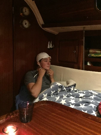 Gutta drar på oppdagelsesferd med jolla, og vi griller på båten til middag - selvfølgelig kortspill om kvelden.