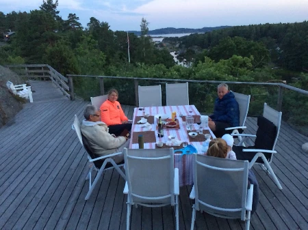 Handletur i Sandefjord by, og blir hentet av Dan på ettermiddagen og kjørt ut til hytta deres. En fantastisk kveld i nydelig vær og kjempehyggelig selskap. Olivia får ordentlig følelsen av å være midtpunktet, og vet å utnytte det. Maria er snill og kjøres oss tilbake til båten ved midnatt.