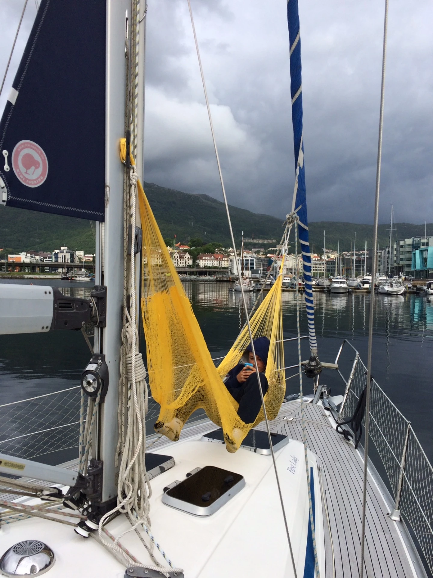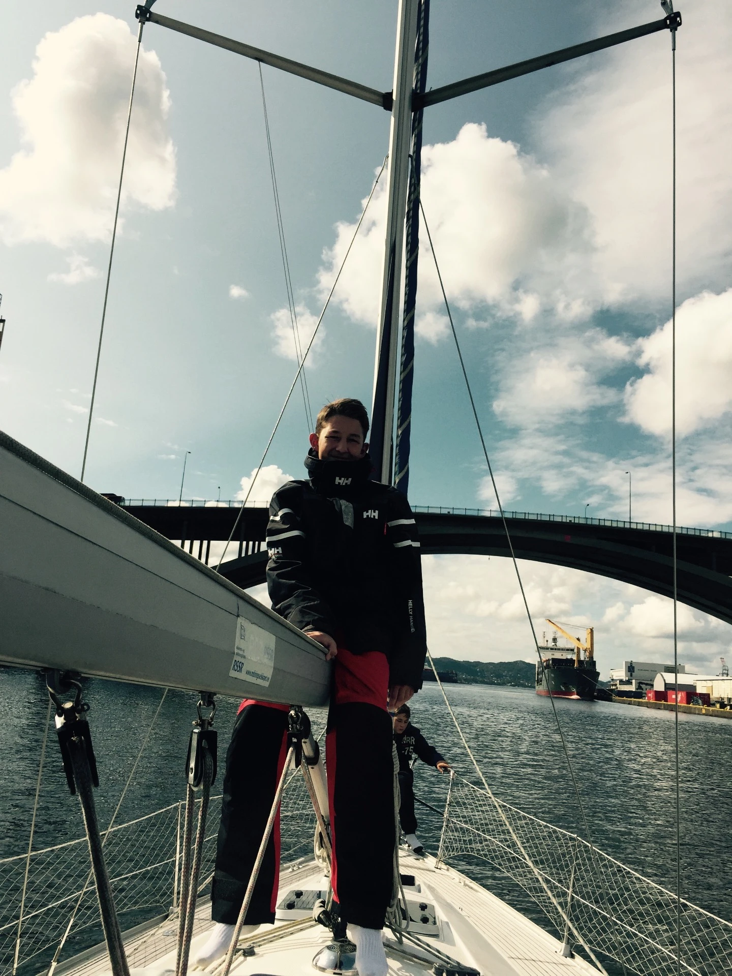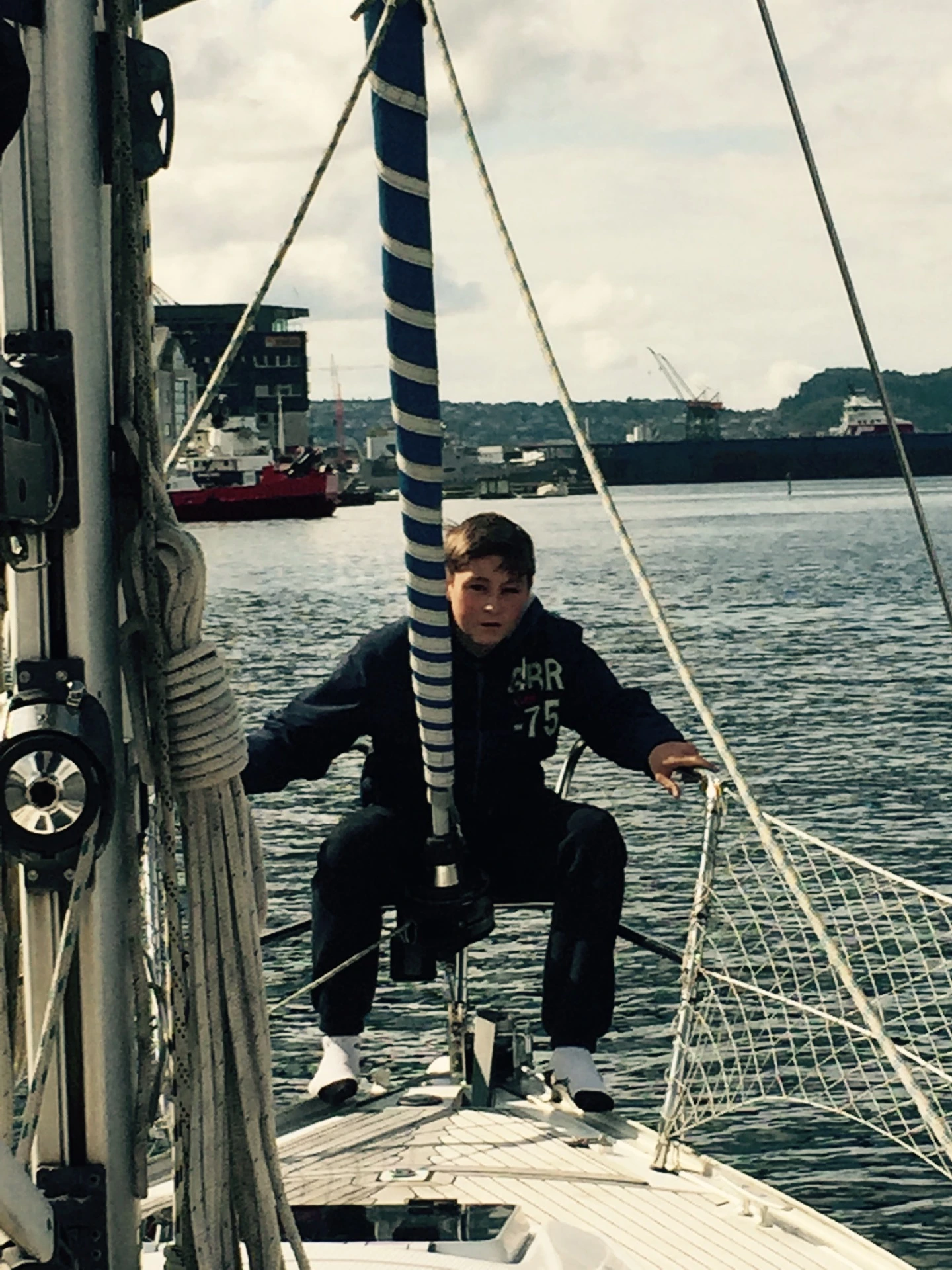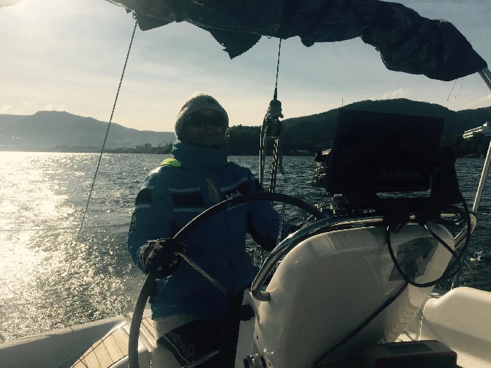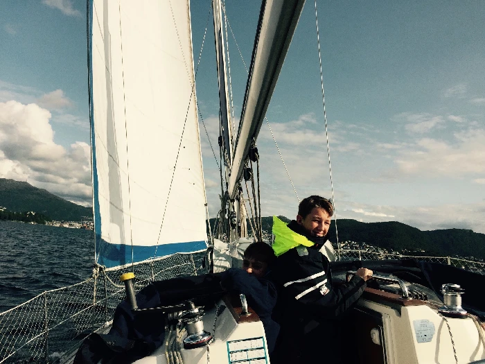 Drar om ettermiddagen ut på vår første prøvetur. Heiser kun genoa, men får endelig følelsen av å holde i rattet på egen båt!